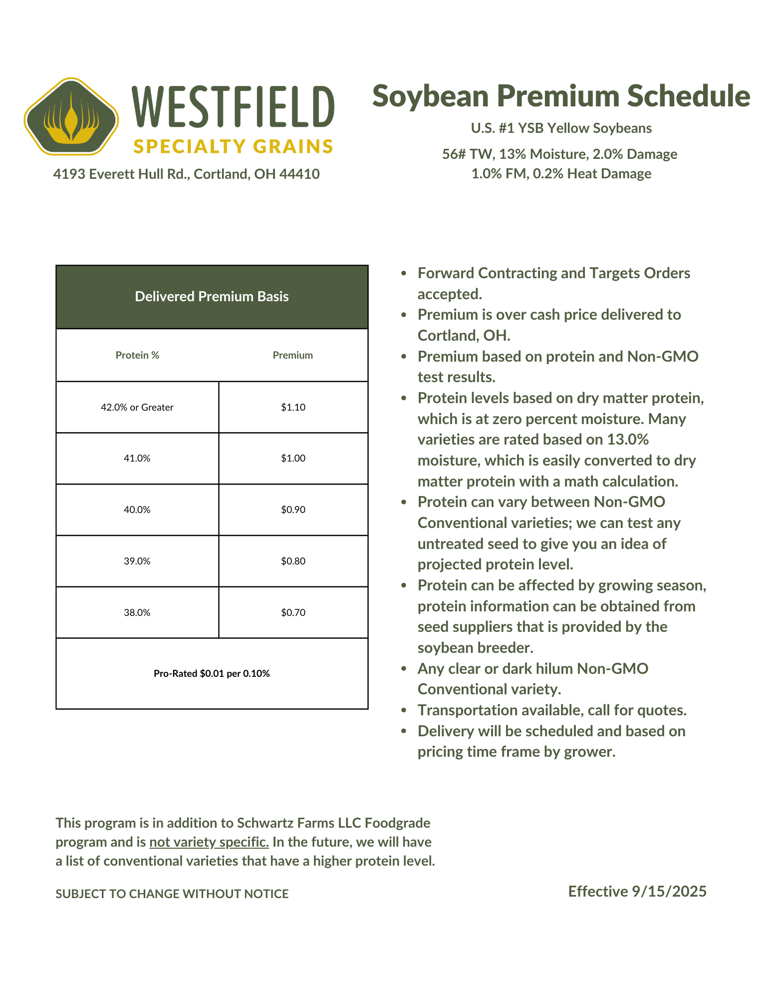 Non-GMO Conventional Soybean Program Download Non-GMO Program Premiums Download Non-GMO Program Discounts Delayed Price 30 Days FREE then10c drop and 8c/bu/month